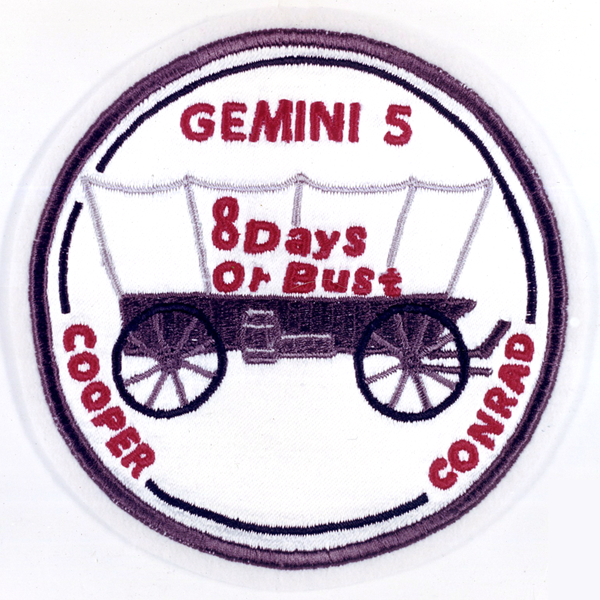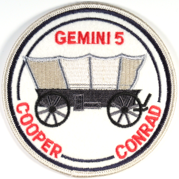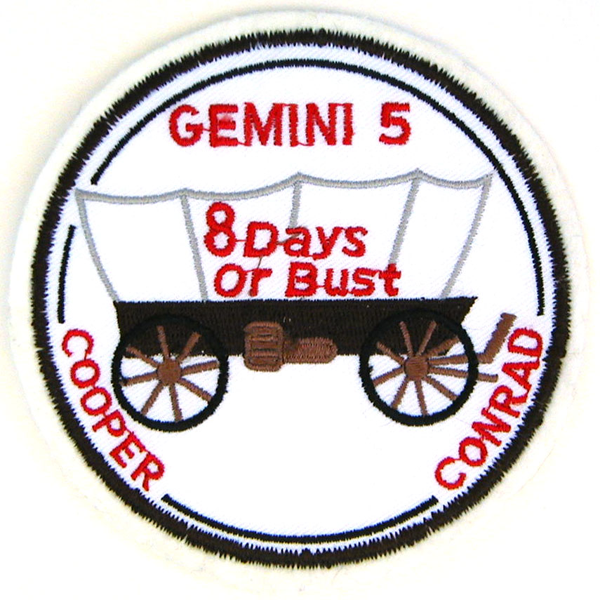 Deke Slayton recalls, “Gordo and Pete were still trying to find a way to individualize their spacecraft. Gus and John had managed to name GT-3; Jim and Ed had worn the American flag on GT-4. Pete hit on the idea of a patch, the kind of thing every Navy air squadron has. It showed a Conestoga wagon with the slogan, “Eight Days or Bust.” When [NASA administrator] Jim Webb saw that, however, he had a fit. He didn’t want the motto, for one thing, and decided upon a whole set of guidelines for what he called “Cooper patches” that each crew commander could design and wear.” (See the memo Webb sent to Deke Slayton.)