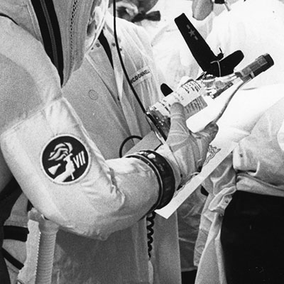 seen on the right arm of Lovell’s lightweight G5C pressure suit. The shoulder