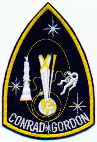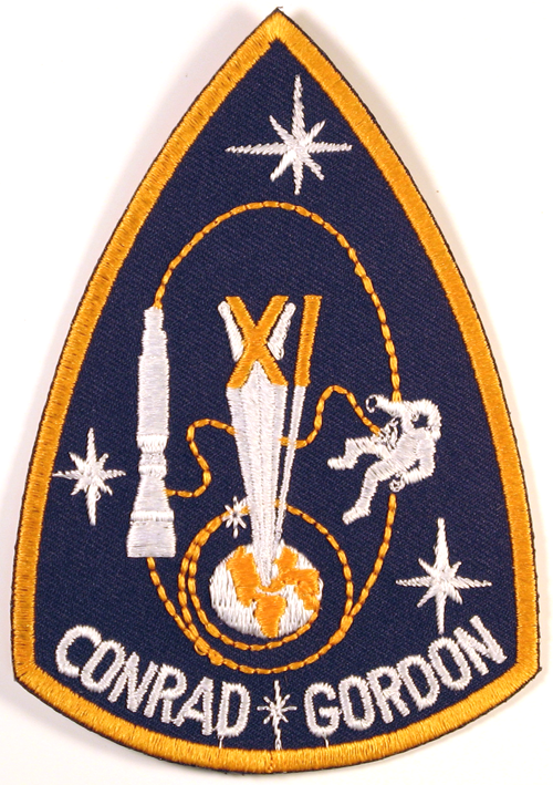 Stars symbolically mark the milestones of the mission: the rendezvous with Agena on the first orbit (marked with a small gold star in the artwork); the docking with Agena; the 1368 km apogee — a new altitude record; and Gordon’s spacewalk. The docking, apogee and spacewalk were also depicted pictorially. The Roman numeral XI projecting from the earth is also symbolic of the altitude record. Conrad and Gordon were both in the Navy, so the patch was executed in the Navy colors of blue and gold.