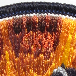 Freas specifically optimized his design for the embroidery process, and it shows. This is perhaps the only patch that looks better in the embroidered version than it does in the original artwork. Notice how the sunburst is depicted in discrete steps, not in continuous gradations: this is exactly what is needed for embroidery and silk-screenining. As he mentions in his article, and as is evident in the artwork, lettering was not his strong suit. One striking oddity is the extra-wide black outer border — this is not something than can be easily accomplished in a standard embroidered patch, and in fact none of the embroidered versions incorporate this feature.