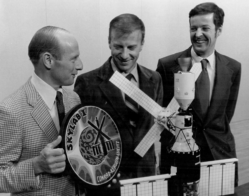 The Skylab crew 1 astronauts display their patch at a press conference.