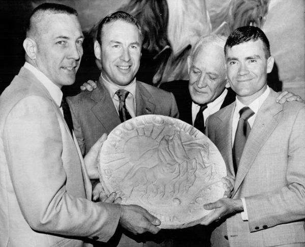 After their flight the crew joined Lumen Winter, who had created this bas-relief roundel inspired by the mural Lovell had seen. This photo (from early June of 1970) was clearly taken at the St. Regis hotel, since the mural appears in the background.