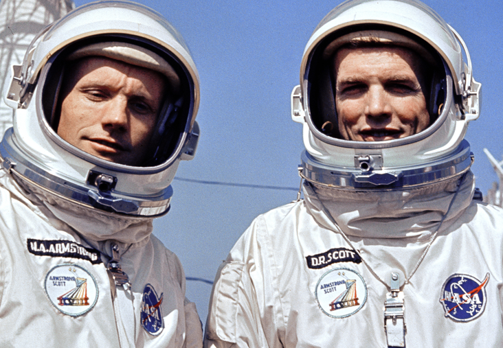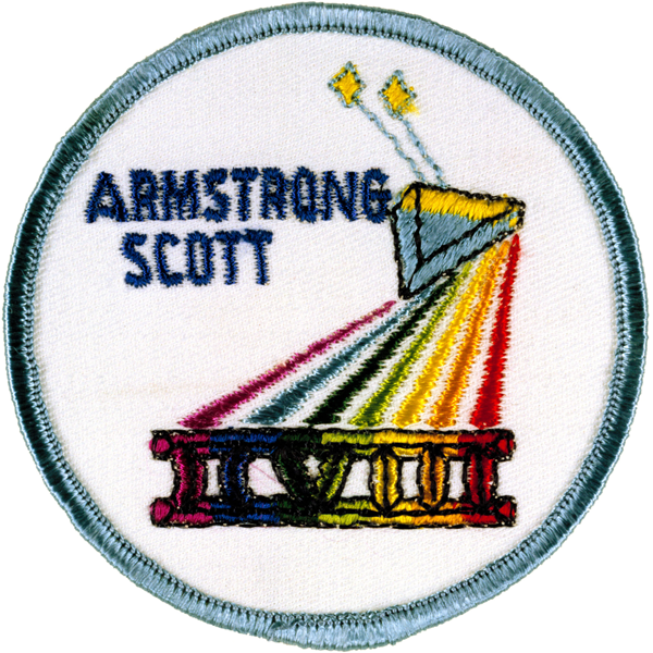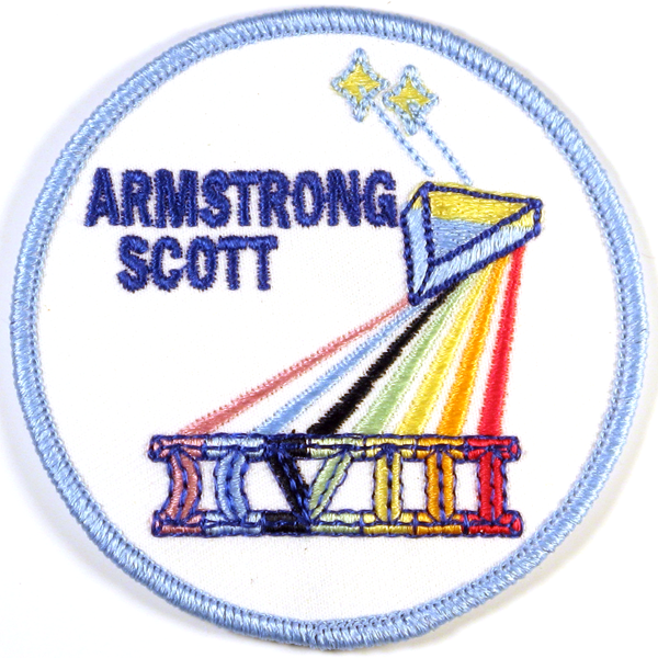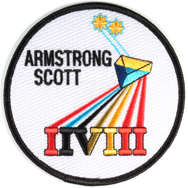 The light from the twin stars Castor and Pollux is split into a spectrum of colors by a prism, indicating the whole range — or spectrum — of project Gemini objectives were covered by this flight. The spectrum projects to the zodiacal symbol for the constellation Gemini, and the Roman numeral “VIII” denoting the mission number. In this way, the patch reads “Gemini 8”, but with just the right number of characters to easily divide the primary colors of the spectrum. The patch was worn on the right breast.