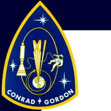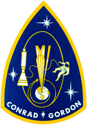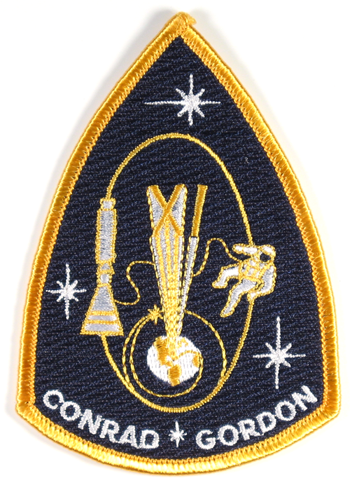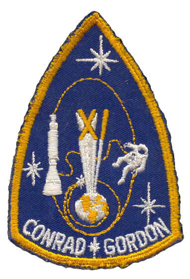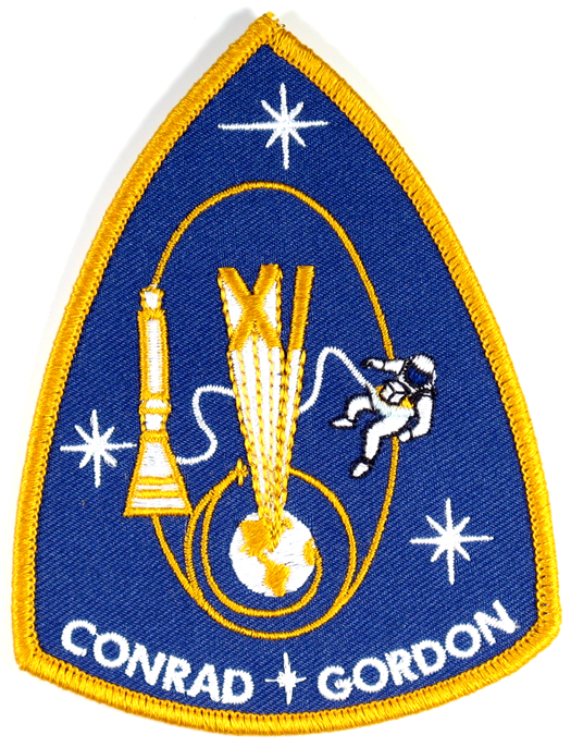 Stars symbolically mark the milestones of the mission: the rendezvous with Agena on the first orbit (marked with a small gold star in the artwork); the docking with Agena; the 1368 km apogee — a new altitude record; and Gordon’s spacewalk. The docking, apogee and spacewalk were also depicted pictorially. The Roman numeral XI projecting from the earth is also symbolic of the altitude record. Conrad and Gordon were both in the Navy, so the patch was executed in the Navy colors of blue and gold.