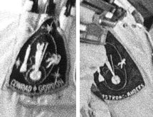 Details from 66-H-1200. On the right is the patch on Dick Gordon’s shoulder; it can be seen here that the lettering is taller than in the artwork (i.e. it is a “condensed” font). On the right is the patch worn by Neil Armstrong; this patch carries the names of the backup crew — Amstrong and Anders.