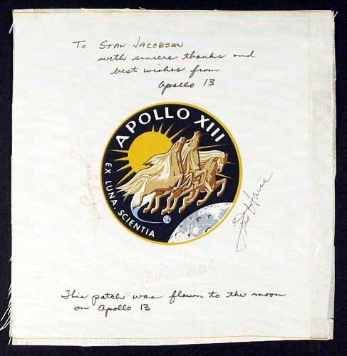 An artist doesn’t always provide the finished artwork, however. For example, while Lumen Winter created the design for the Apollo 13 patch, it was only a bas-relief roundel. This was passed on to the MSC art department, where Norman Tiller created the color version of Winter’s design. In the case of Apollo 15, Dave Scott asked Emilio Pucci to design his patch, but when Pucci provided only a roughly sketched design, Scott handed it over to the MSC art department where Jerry Elmore did the final rendering. The astronauts usually credited Stanley Jacobsen for the final patch artwork, and he was the person who got the flown, inscribed beta cloth patches (like the one shown below). In reality, Jacobsen was the head of the art department, and always handed off the actual work to someone in his crew, while he liaised with the crews.
