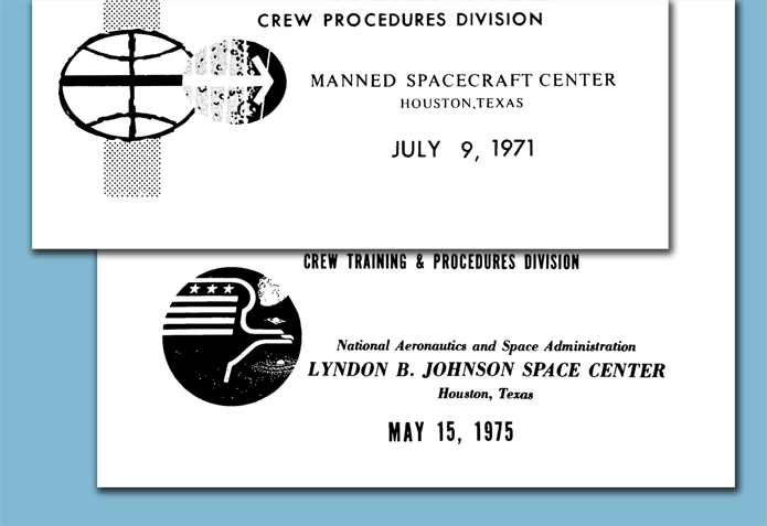 For internal-use publications, the NASA Manned Spacecraft Center (MSC) in Houston had a standard cover that carried a bit of symbolic artwork at the bottom essentially symbolizing “Earth to Moon” — more or less the raison d’être of the center. When the center was renamed in 1973 to honor President Lyndon Johnson, the standard cover was redesigned, and in place of the previous artwork, a modified version of McCall’s Apollo 17 patch was used.