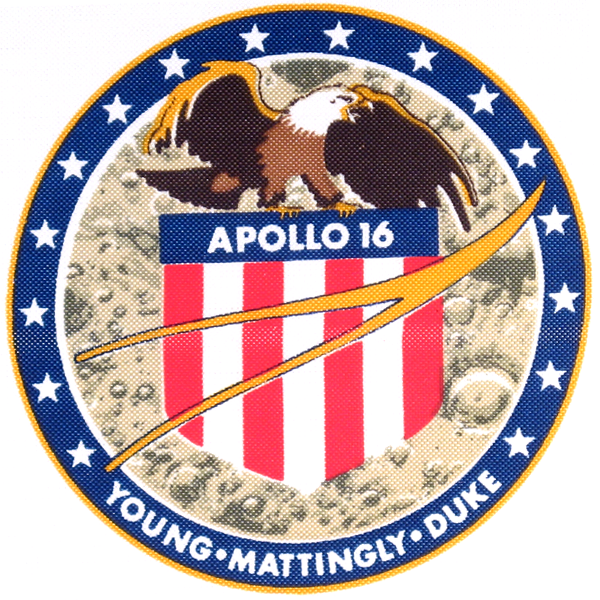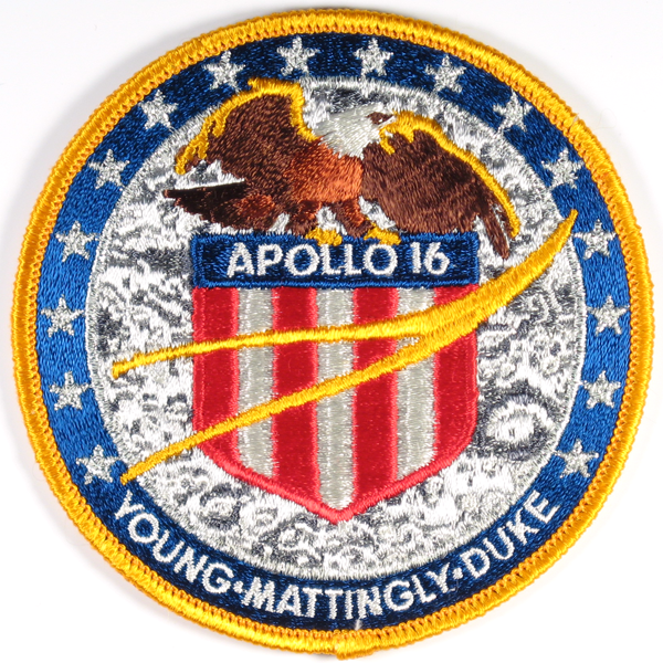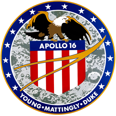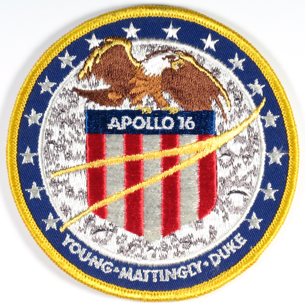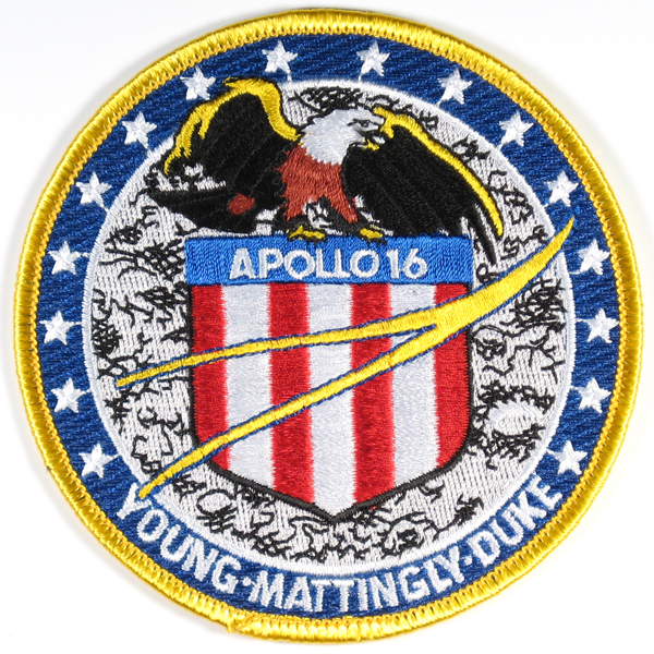 Basically, the design was a brown and white eagle with wings outstretched, perched atop a red, white, and blue American seal, over a gray lunar surface background. To show teamwork, the yellow NASA wishbone symbol of flight was placed on top of the seal, and then across the seal were written the words Apollo 16. Circling a blue and gold border were our names — YOUNG, MATTINGLY, and DUKE — and sixteen white stars to emphasize outer space and the number of our flight. We were very proud of this patch, which to us symbolized Apollo 16.