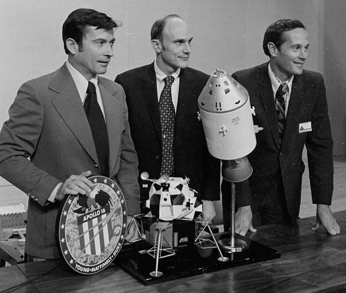 The Apollo 16 crew showing off the artwork for their patch at a press conference.